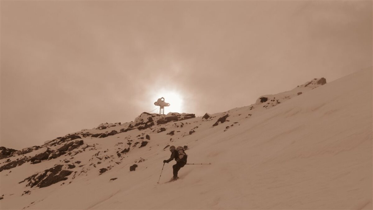 Das Nassfeld flach hinein und hinaus, das kommt halt bei der Tour immer noch erschwerend dazu. Die ersten Höhenmeter ist es noch weich, wird dann aber besser und so gehts zügig hoch. Oben erwartet uns mal wieder ordentlich Wind. Dabei hatte ich Glück, mein in den Schnee gesteckter Ski wurde gelupft, blieb aber 50hm weiter unten stecken.