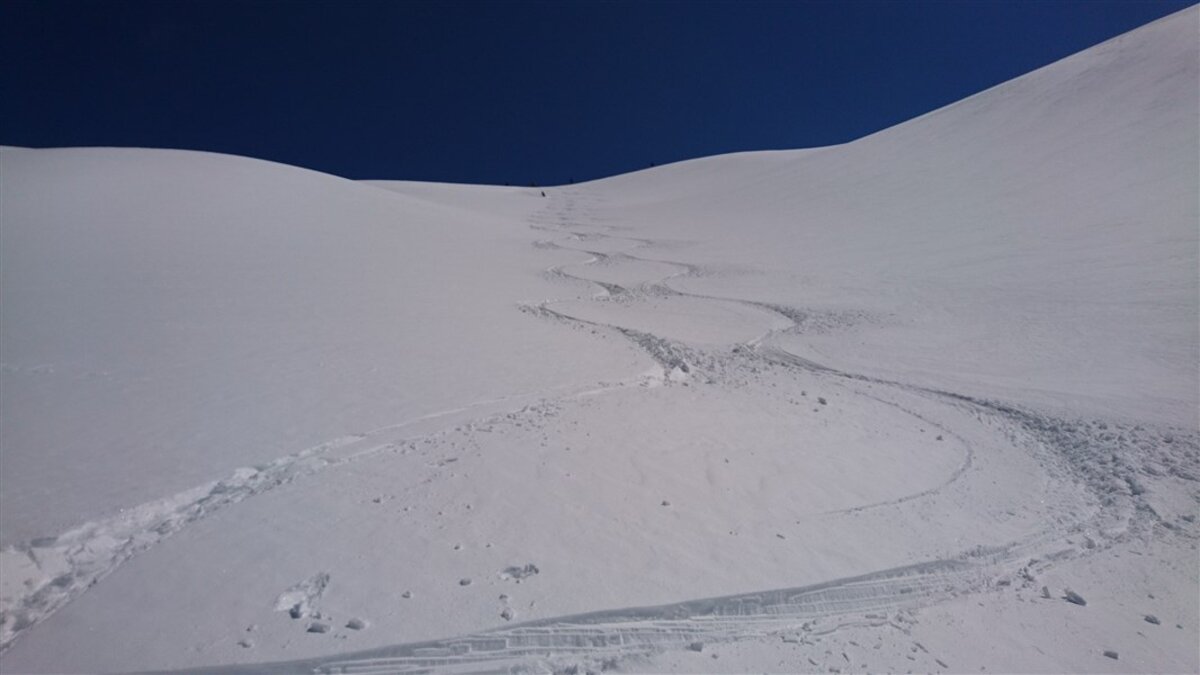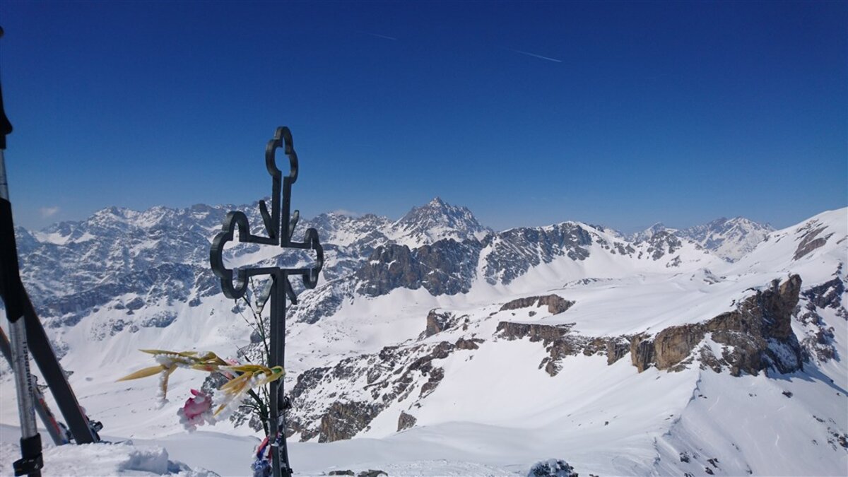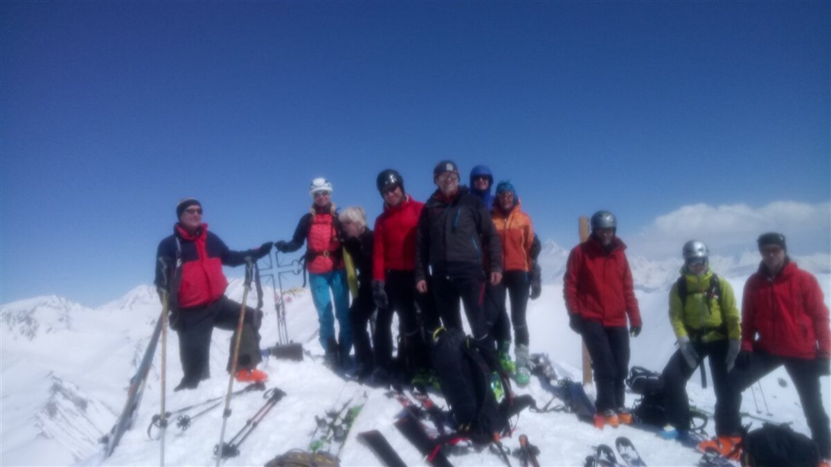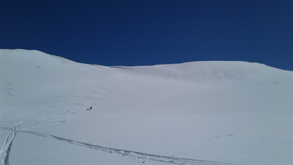 Es heisst Spuren. Wir wechseln uns ab, denn in 30cm gesetztem Pulverschnee, der immer schwerer wird, ist das nicht so leicht. Dafür können wir oben eine wahnsinns Rundumsicht genießen und als draufgabe noch eine unverspurte Pulverabfahrt.