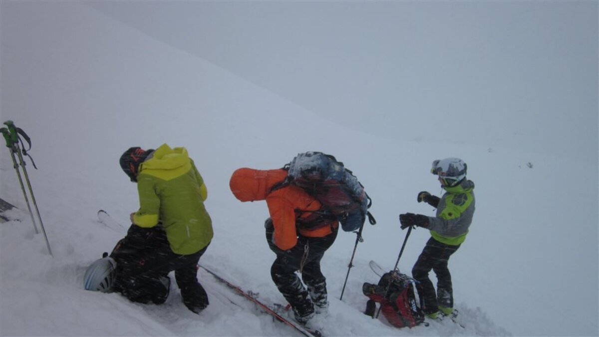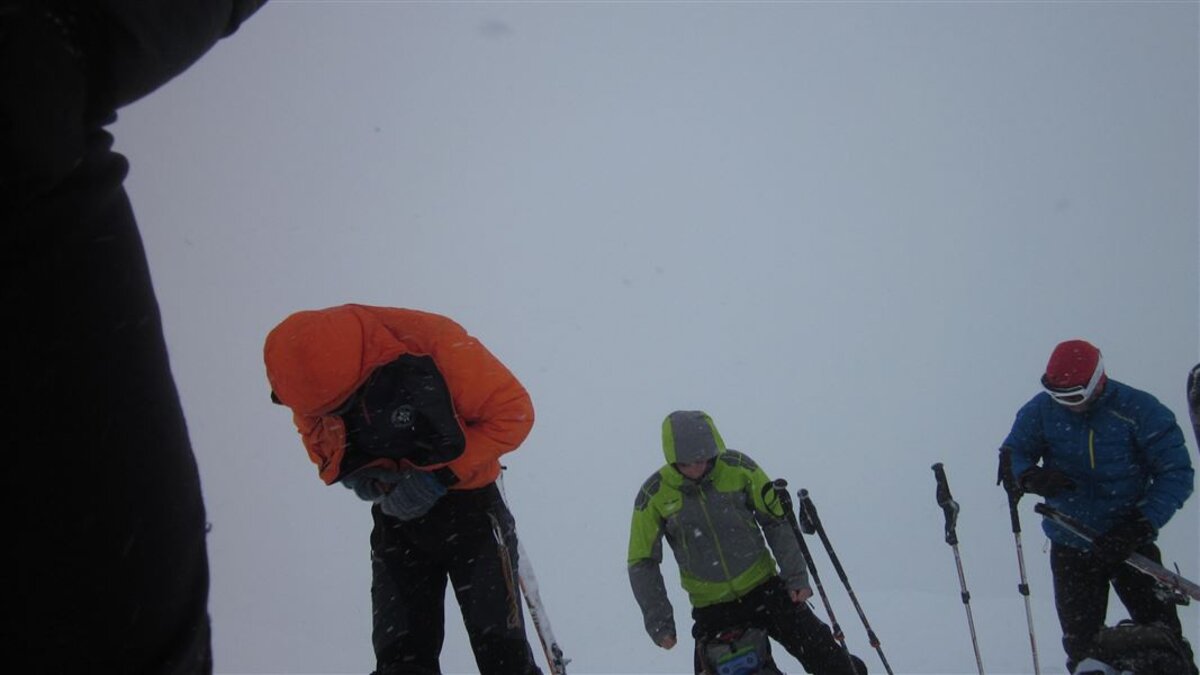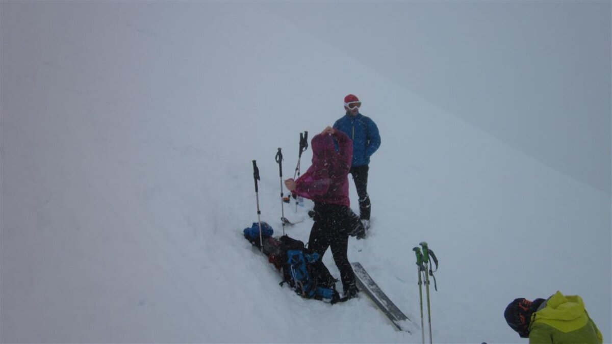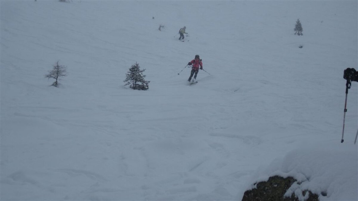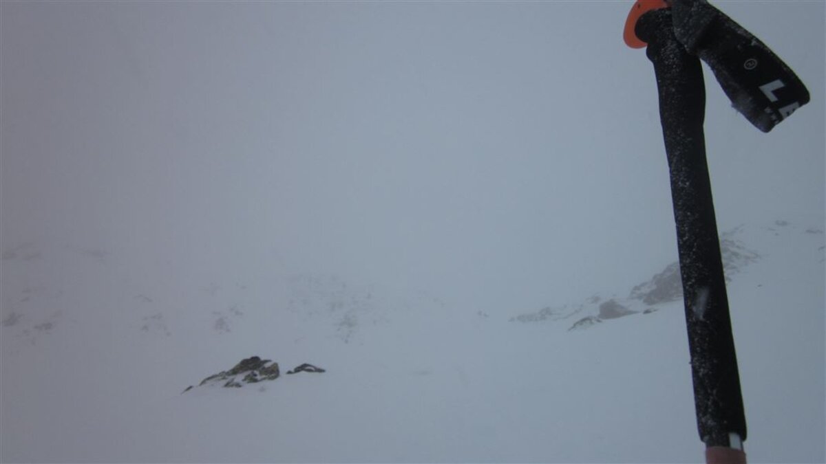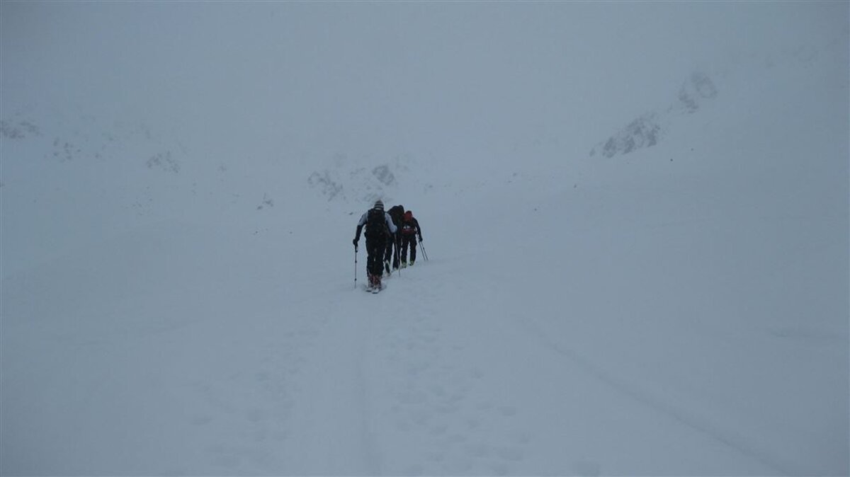Unten gehts zuerst auf der Skipiste, dann auf einer Rodelbahn. Oben wird das Wetter immer schlechter und damit auch die Sicht, es gibt zwar eine Spur, aber kurz vor dem vermuteten Gipfel entscheiden wir, abzubrechen und umzudrehen. Die Abfahrt ist dann eh auch eher wenig spassig, die Sicht ist diffus, man kann keine Konturen ausmachen und muss vorsichtig entlang der Aufstiegsspur abfahren.