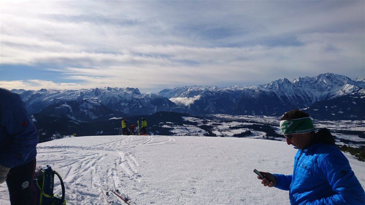 Heute mal was chilliges, kurzes, mit Roland und den Schimpkes. Viel Schnee ist leider nicht, die Grundlawine ist abgegangen und man muss ein paar Meter übers Gras. Die Abfahrt ist dann kein Genuß, tief, weich, anstrengend. Wurscht, wenigstens draußen und was getan.