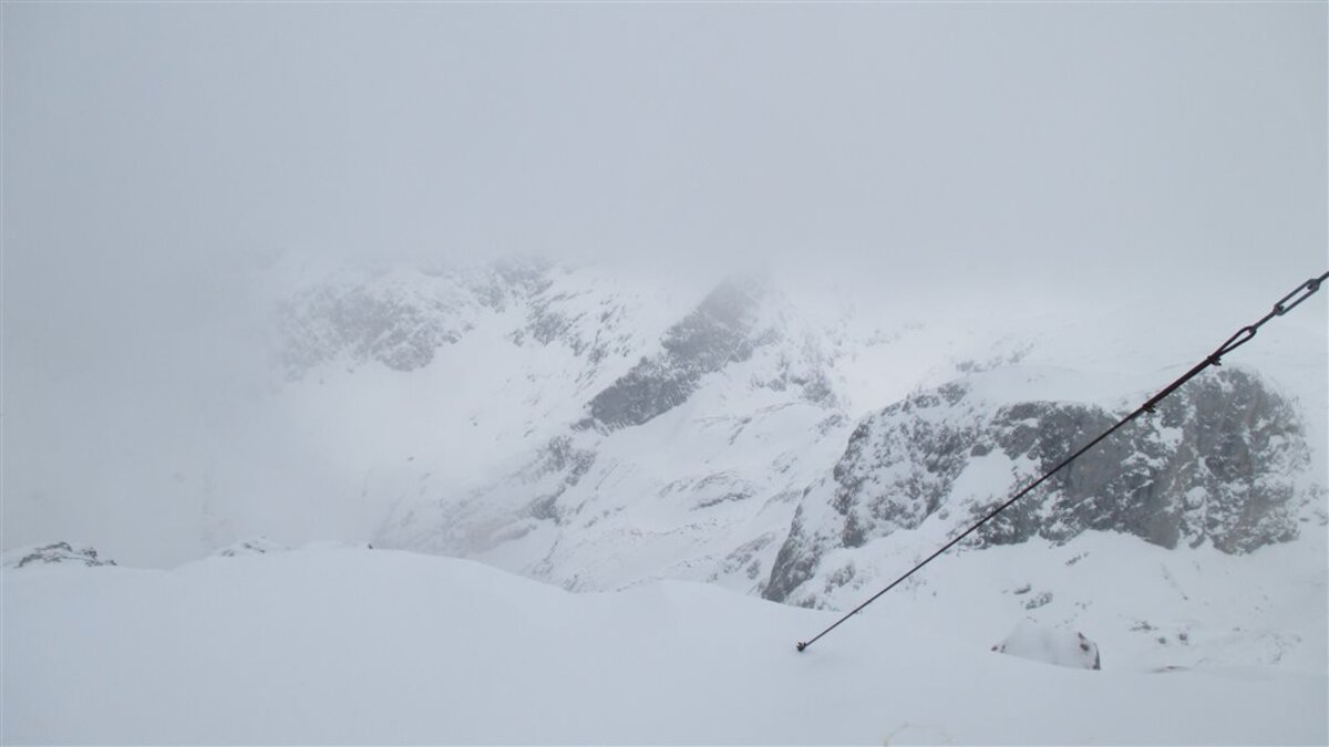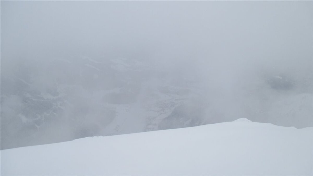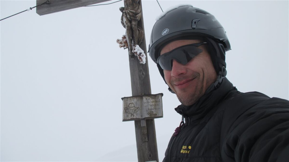Die Sicht ist nicht gut und es ist kalt. Nach 2h steh ich oben und am Gipfel ist es endlich mal windstill. Allerdings kann man die Aussicht nicht genießen. Dafür die Abfahrt. Pulver von oben bis unten, die alten Spuren sind gut zugedeckt und stören nicht.