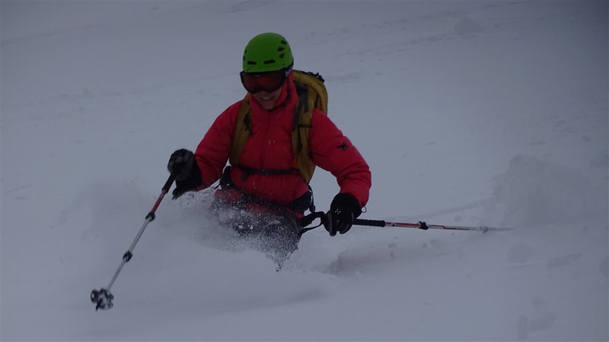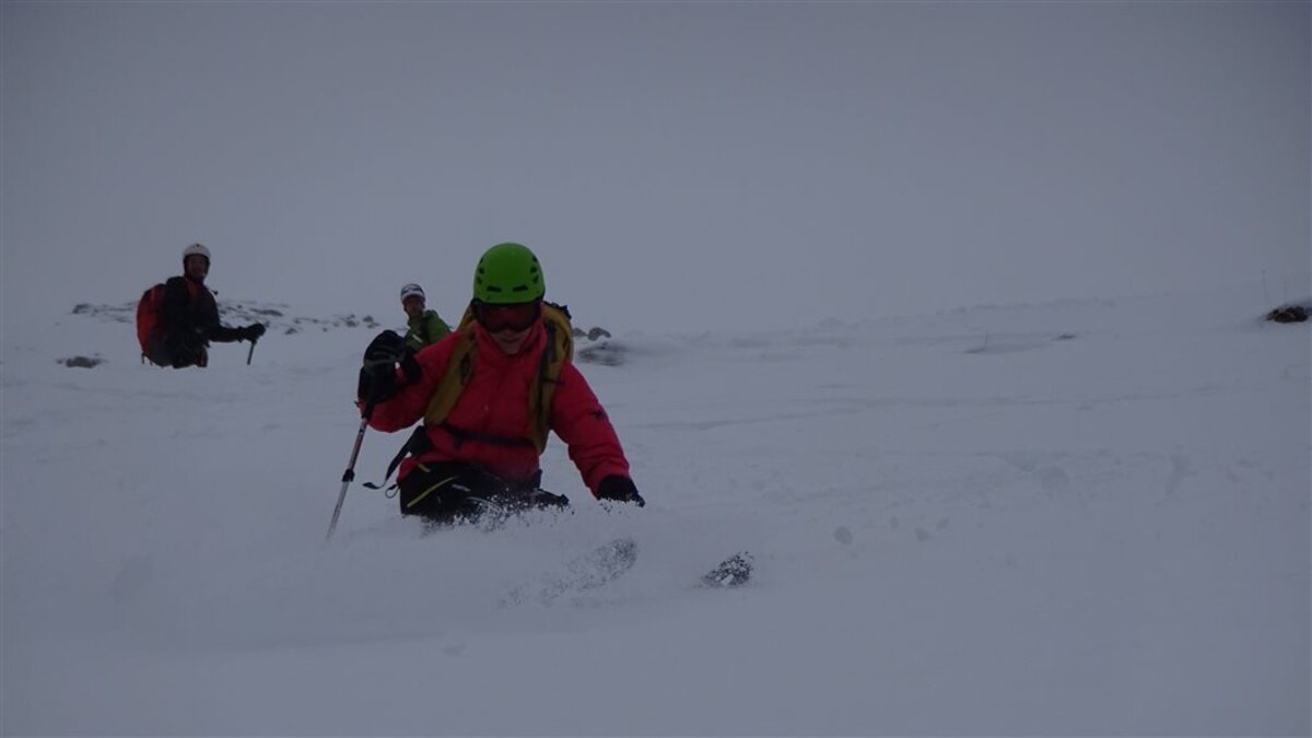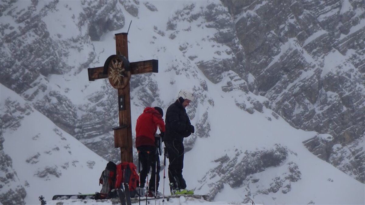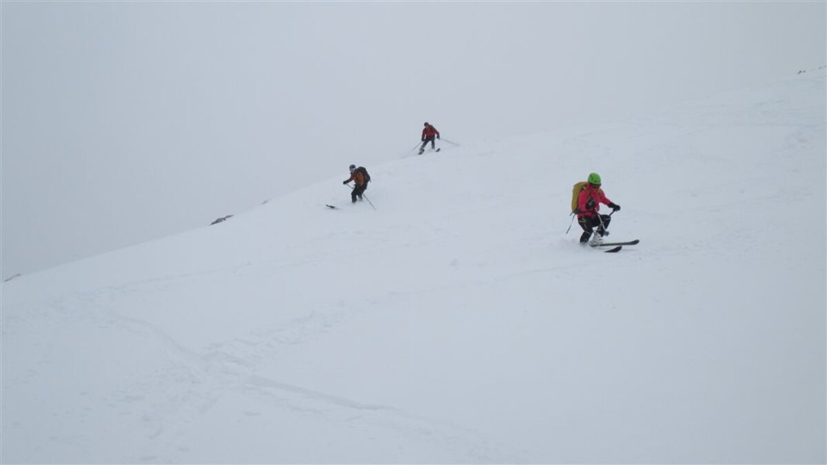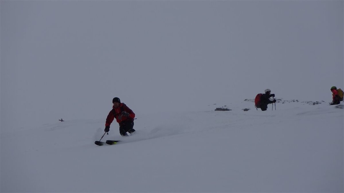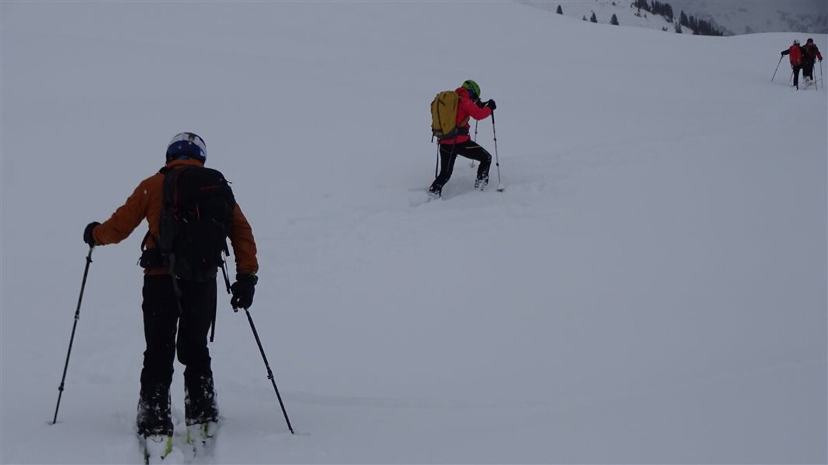 Der letzte Hang sieht dafür schon von weitem lässig aus, allerdings gibts beim hochgehen mehrere 'Wumm'-Geräusche, so dass wir lieber die konservativste Abfahrt entlang der Aufstiegsspur wählen. Trotzdem eine spassige, kleine Tour.
