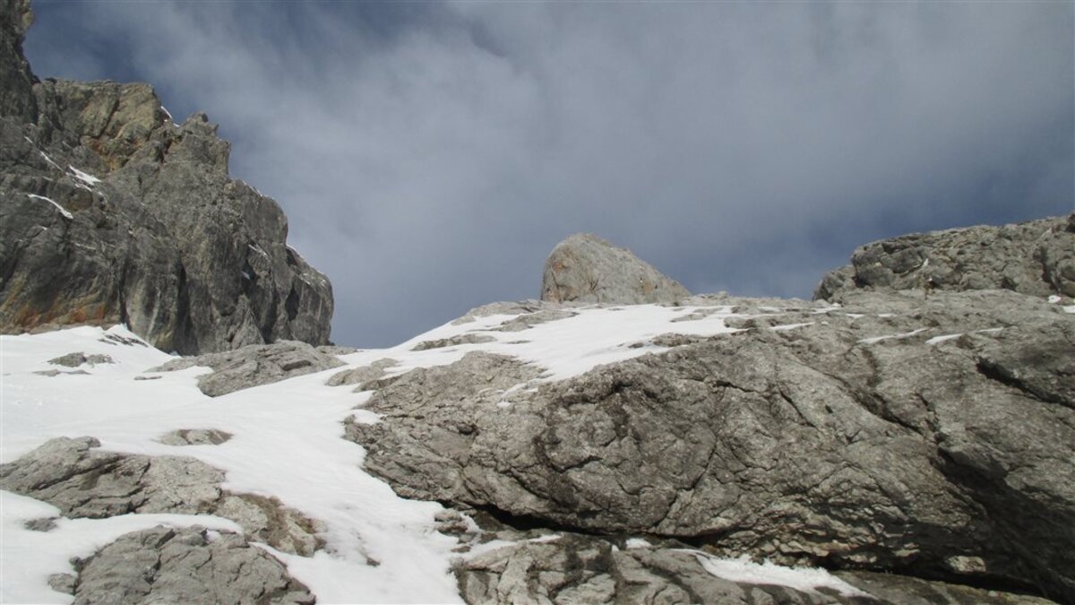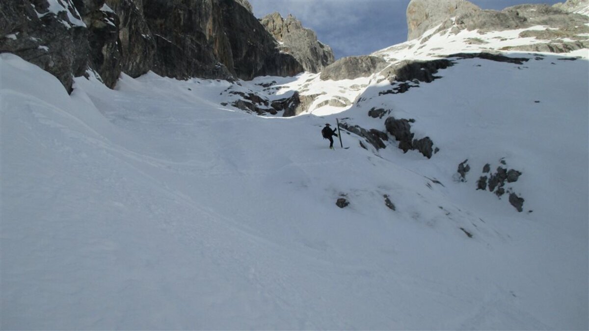 Ein Bekannter vom Roland hat gemeint, das Birgkar würde gut gehen - ich bin skeptisch. Von unten sieht es nicht nach viel Schnee aus, aber nach knapp 250hm können wir die Ski anschnallen. Oben im Steilen dann viel eingewehter Schnee, aber mühsam zu gehen und zu fahren. Nach der steilen Engstelle kommen wir wieder in die Sonne und dort lassen wir es.