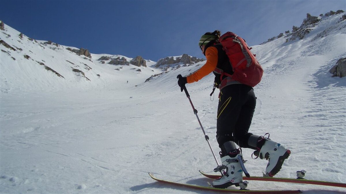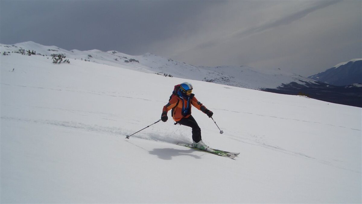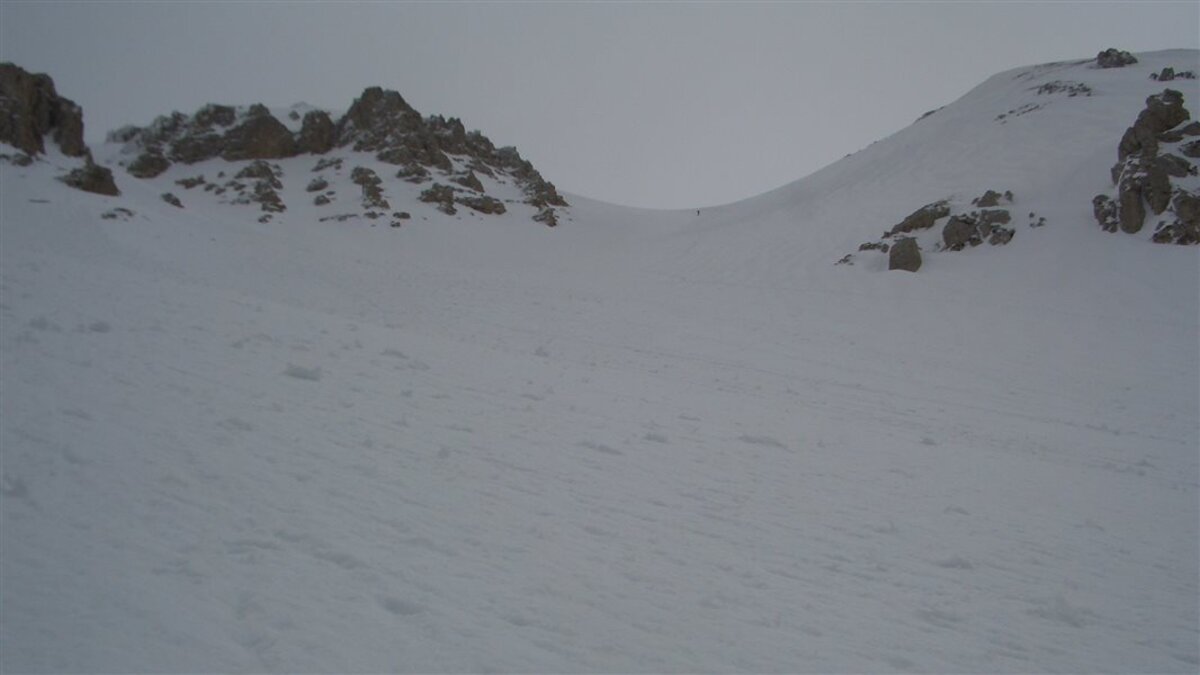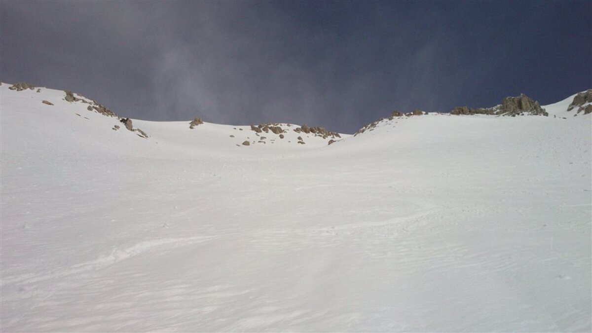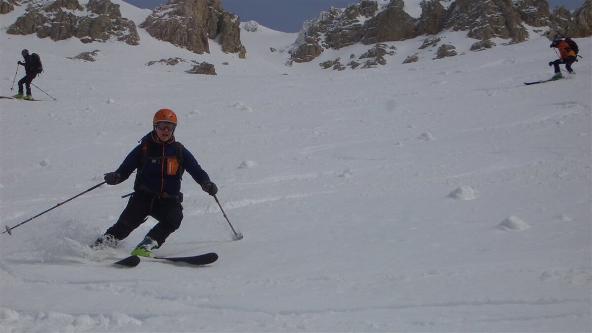 Das Wetter hielt aber, so dass nach mir fast alle am Gipfel waren. Oben war es stürmisch und richtig ungemütlich, so dass ich lieber unten warten wollte, auch wenn oben ein geräumiges Biwak zum Umziehen steht. Die Abfahrt bot dann immer wieder schönen Firn, aber auch gepressten Pulver, mit manchmal unerwartet großen Einsinktiefen. Nicht ganz leicht zu fahren, aber für uns Könner natürlich kein Problem ;)