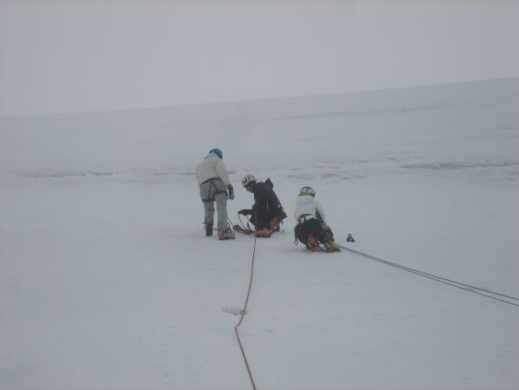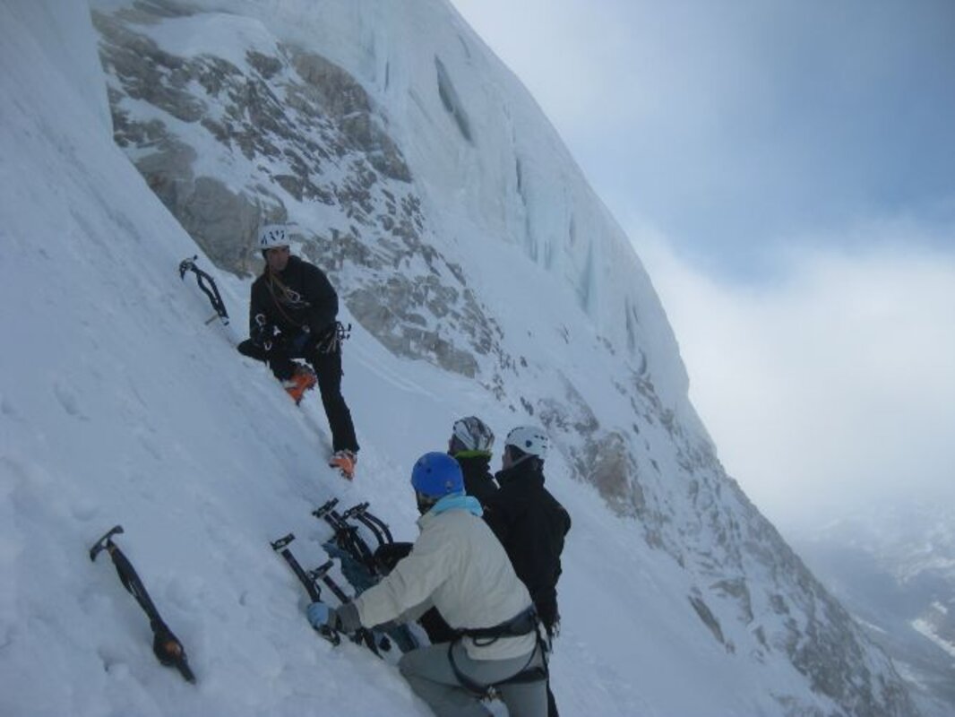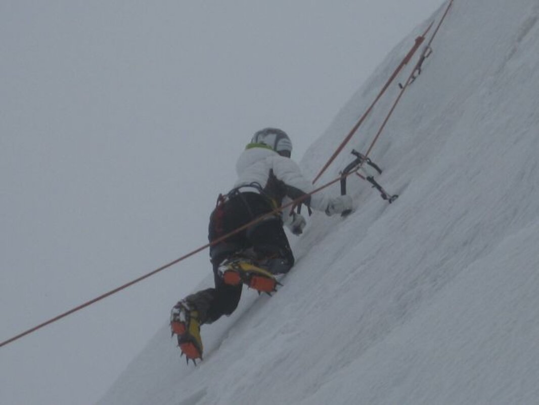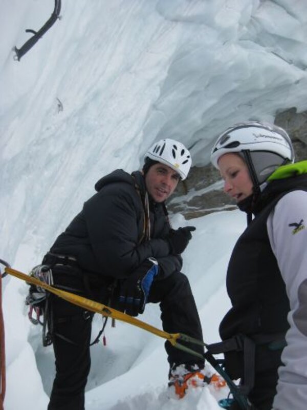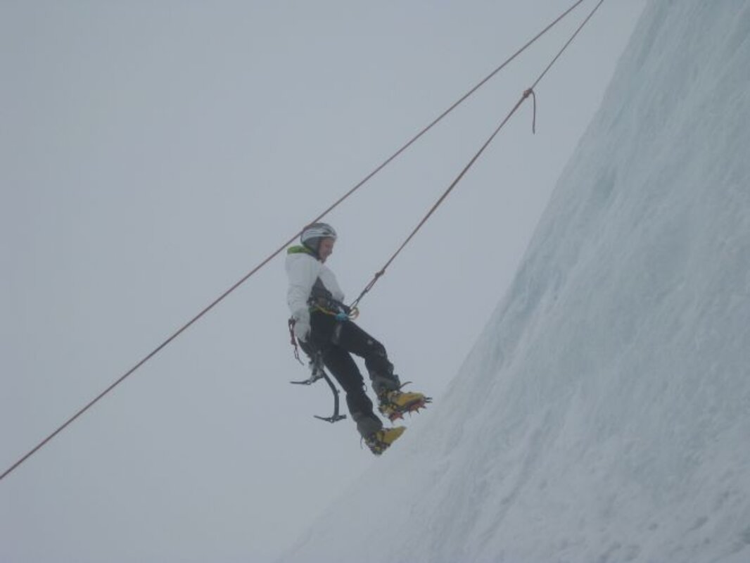 Hansjörg – der Bergführer – hat sich echt Mühe gegeben mit uns und wir haben viel mitgenommen von dem Tag, richtiges bewegen im Eis, Eisschrauben setzen, Eissanduhr, Standplatz und Abseilstand bauen.