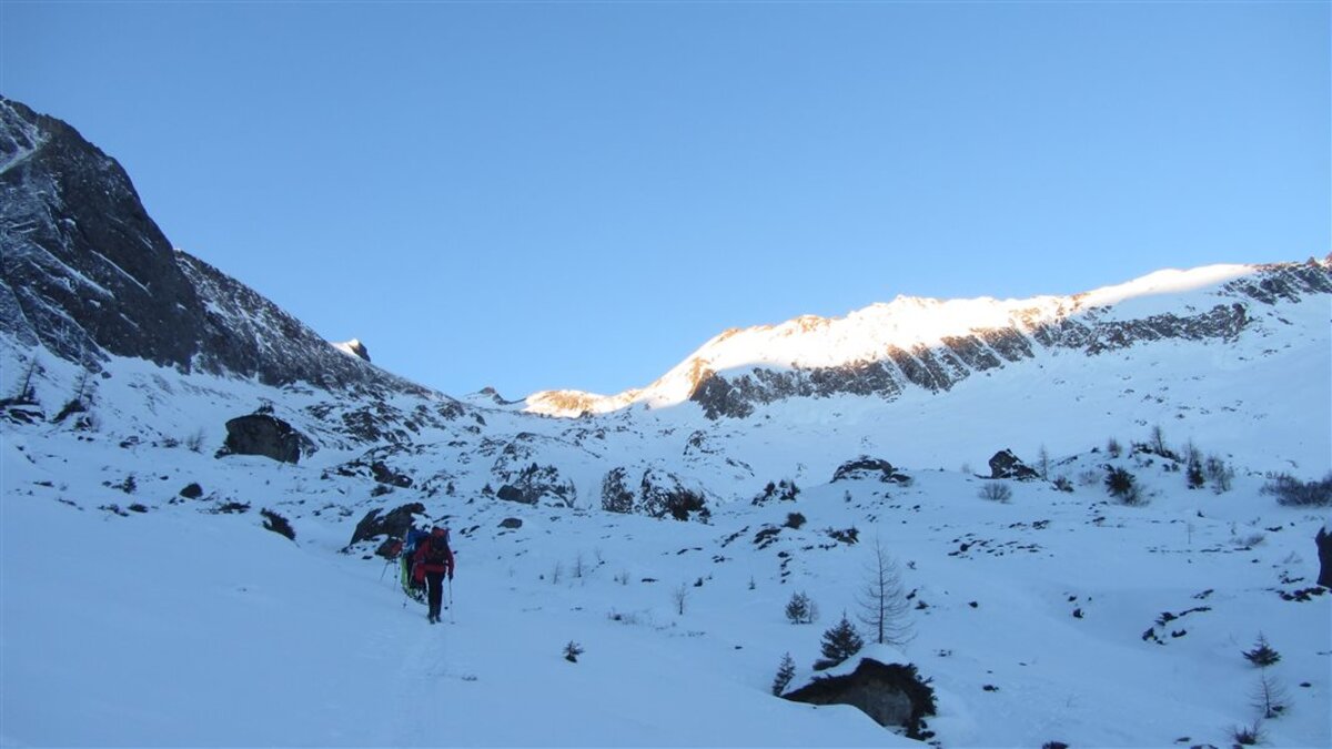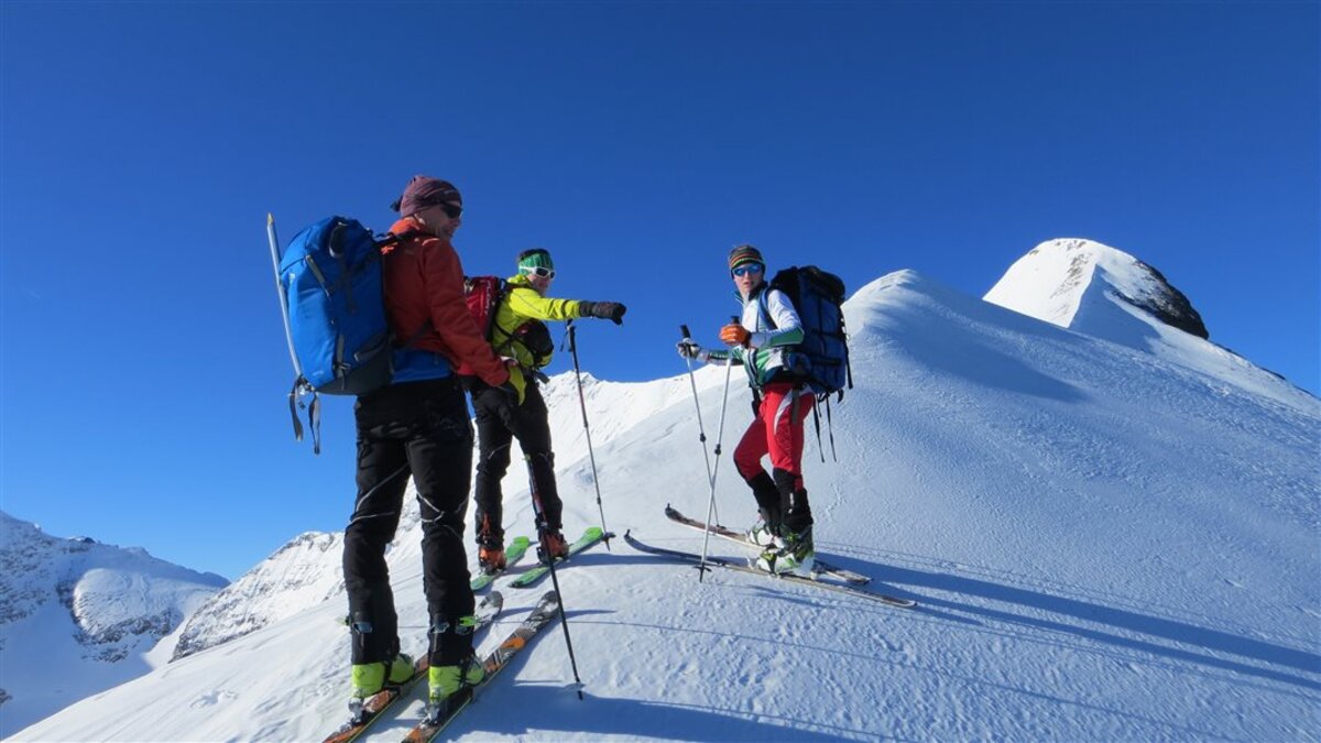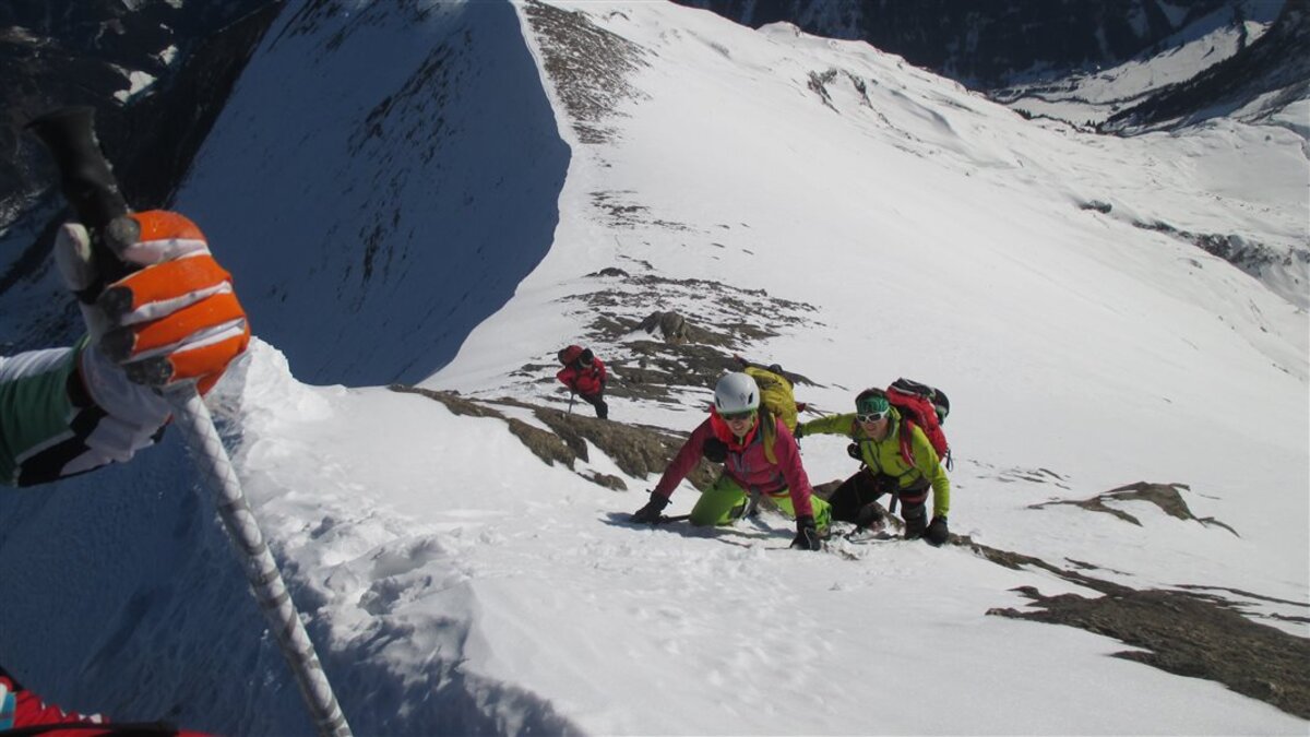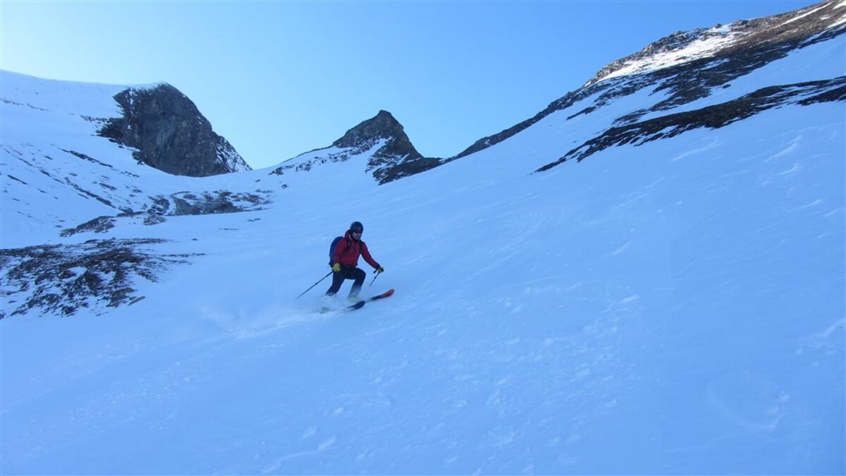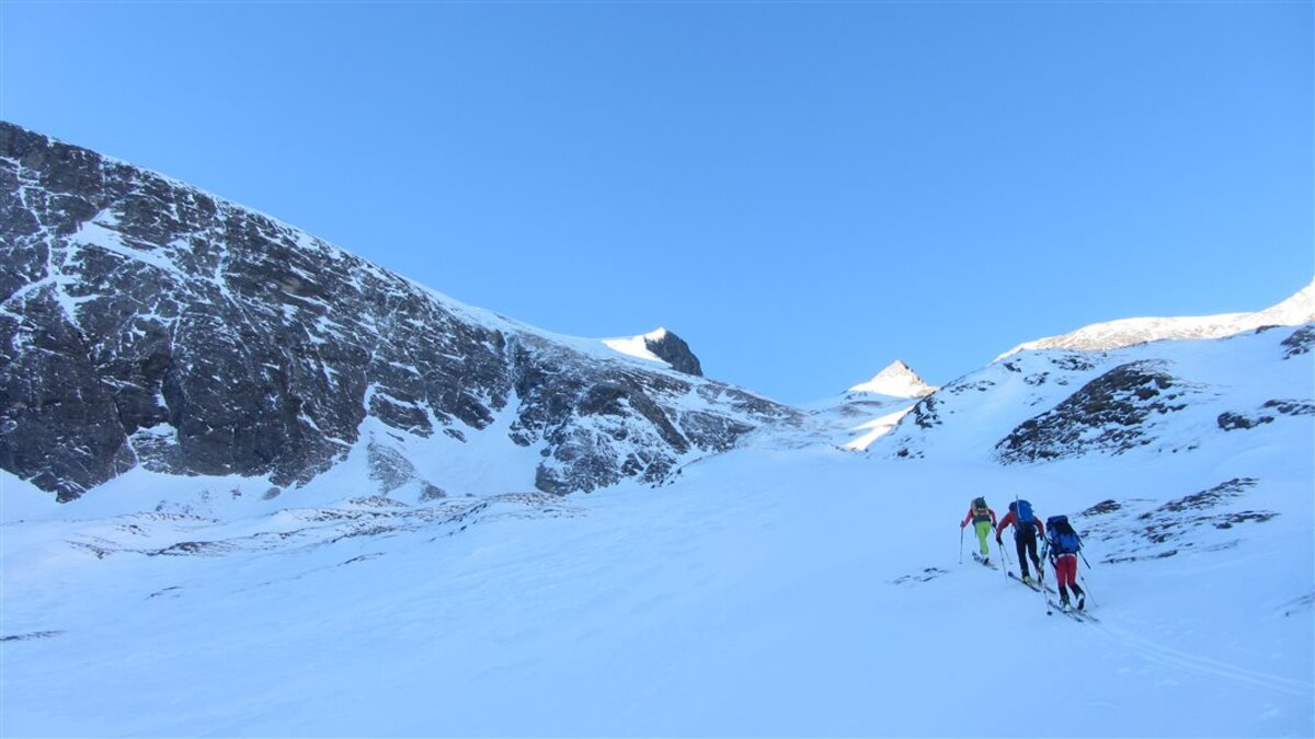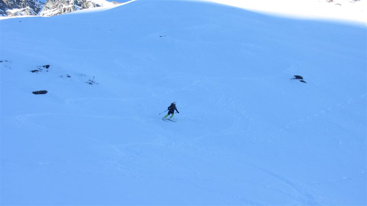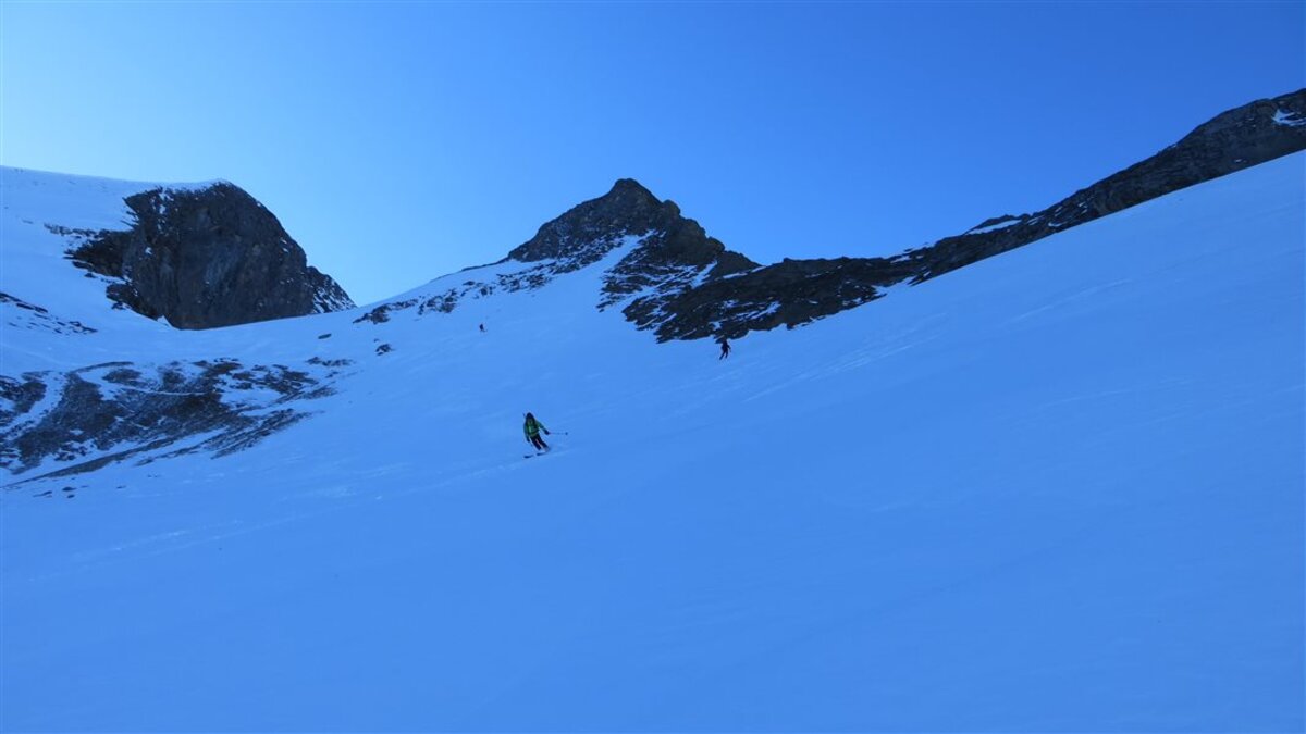 Den Weiterweg zum Hohen Tenn sparen wir uns, die Tour hat auch so schon ziemlich ausgegeben. Die Abfahrt ist dann wie erwartet hart. Wir suchen Firn und fahren ganz nach links, aber es werden nur wenige Schwünge. Die Sonne ist nicht lang genug da gewesen...